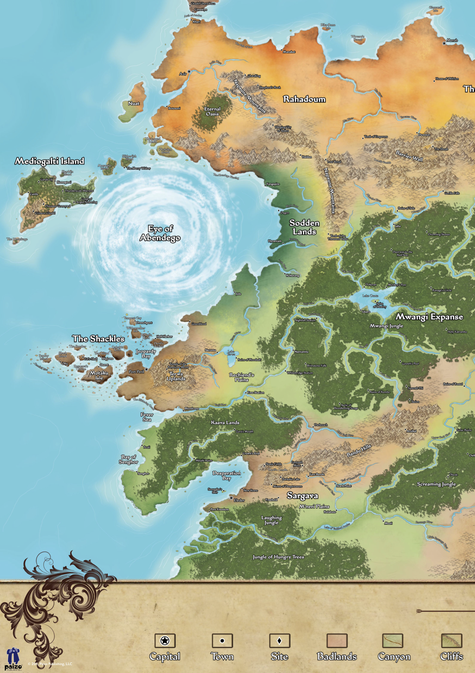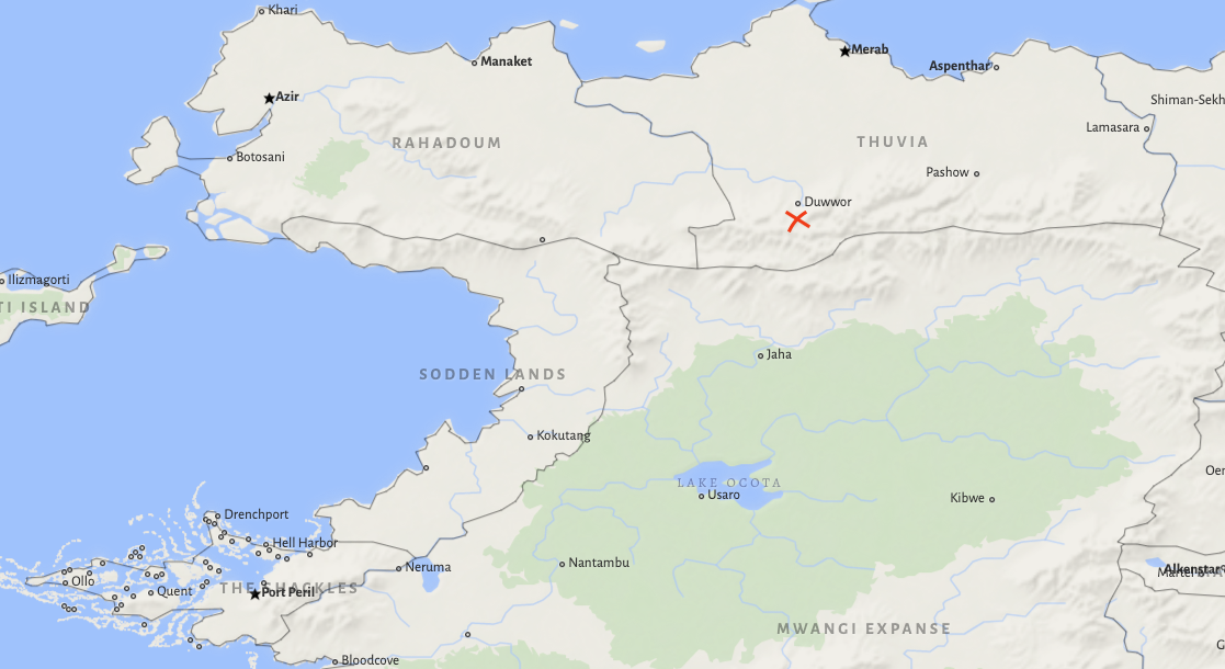 Returning to Quent, we visited the House of Stolen Kisses, a temple of Calistra, and spoke with the high priestess, Dindrian. One of her priestesses heard of a man named Jamies Keft, a scrimshaw from Drenchport who claims to know about spies in the Shackles. Drenchport is the closest city to the giant vortex, which causes much rainfall and different weather patterns.