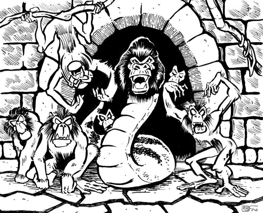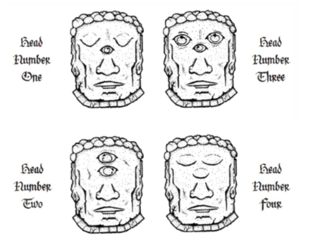 We heard strange ape-like noises coming from far away, which made us nervous. We proceeded to explore the area and discovered five god statues made of different materials. The first one was made of black stone, had six arms, horns, and a malevolent look, representing their evil god. The second statue was made of bronze and depicted a woman sitting in a cross-legged position. She had four arms and was holding a child and a cow. The third statue was made of burnt clay and had a crocodile head, a rough texture, and a large axe. The fourth statue, which was the worst of them all, was made of wood and had a womanâs head with a bird-like appearance. The fifth statue was made of stone, had four arms, a gazelle head, and held a lightning bolt in one hand and a cloud in the other. Its lower hands held a plate.