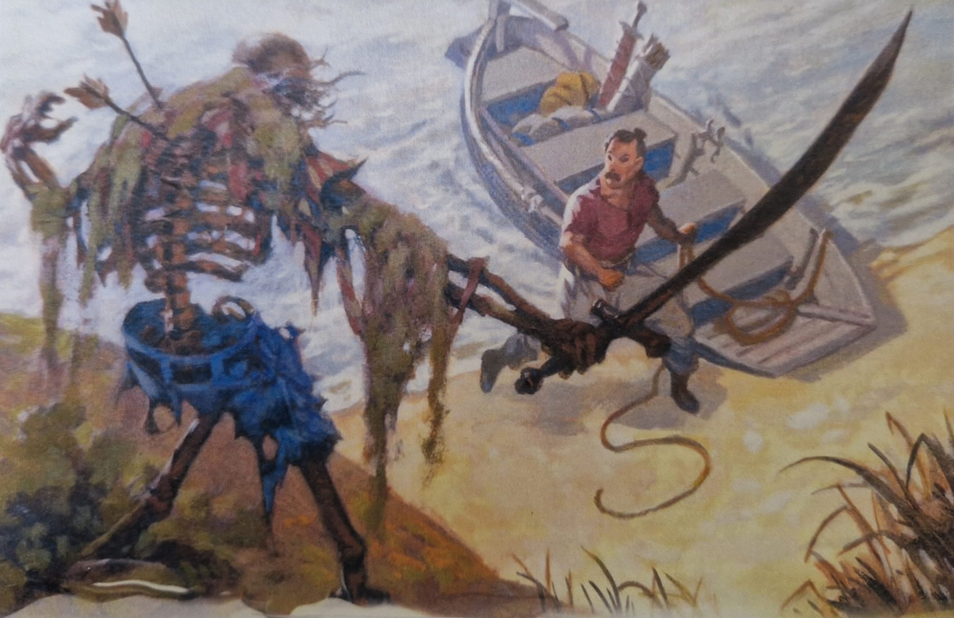 We arrived at Zun Kâthon Island and encountered heavy rainfall. We landed near a pier and a sunken ship, where we were attacked by skeletons rising from the sand. We discovered a two-pronged weapon that seems to indicate a direction towards Lexandros location. Beyleaf and the priest Odium and were the only survivors of the Zun Kâthon encounter. We left Odium on Vezhnu and Beyleaf accompanied us.