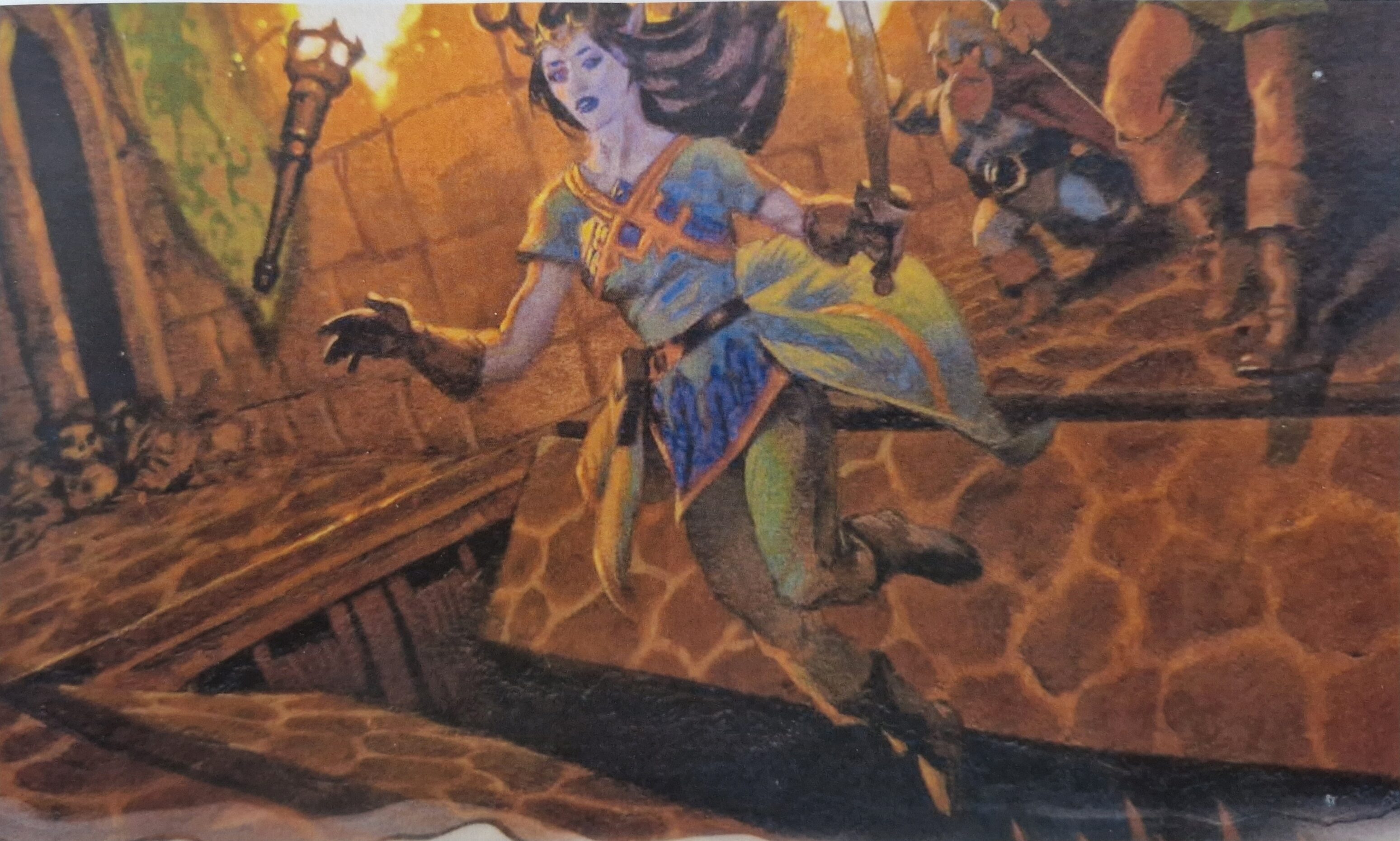 We encountered several doors, including one made of iron with a lock, one made of copper with a lightning trap, and one made of bronze. We also found several sarcophagi, including one belonging to King Talaharki of Madaroshanti, which we were warned not to disturb. The king was buried with his weapons, including a ring mail, a fancy helmet, and a two-handed sword. We also found a jar of magic-stopping salve, which contained eight doses. There was also a small copper bottle with a liquid inside, which Kibi identified as Potion of Vitality. This potion could cure any diseases or poisons and remove any exhaustion until the next long rest. We also found a large metal wand with a star on top and a container made from a human skull filled with a liquid.