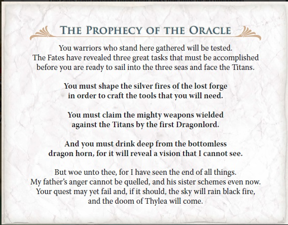 “You warriors who stand here gathered will be tested. The Fates have revealed three great tasks that must be accomplished before you are ready to sail into the three seas and face the Titans.”