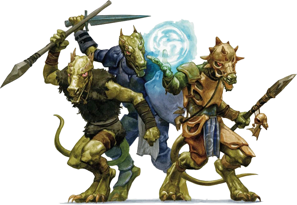 Kobolds are often dismissed as cowardly, foolish, and weak, but these little reptilian creatures are clever with their hands, and viciously work together in order to overcome their physical limitations. Kobold are short in stature, despite the draconic blood running in their veins, with the tallest of them barely reaching 3 feet and weighing no more than 35 pounds. Because of their small size, kobold often have to adopt unorthodox means of achieving victory. This usually leads to traps, which kobold are well known for crafting.